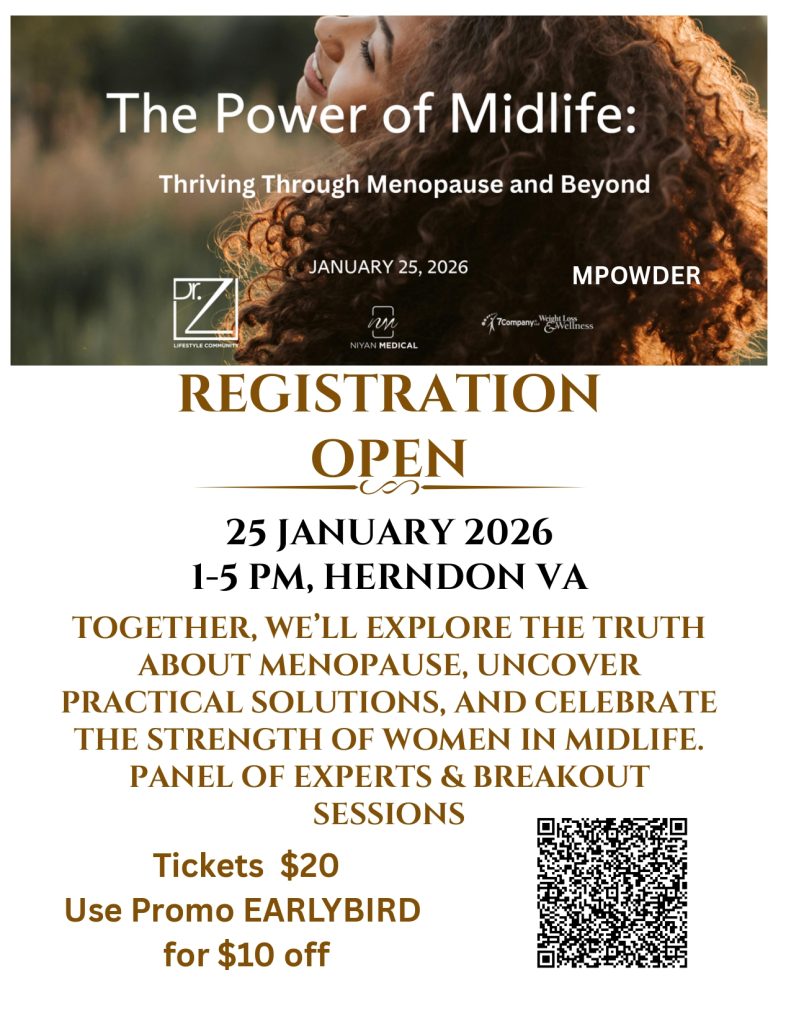 34. The Power of Midlife: This is a conference with information sessions and exhibitors being organized by doctors and practitioners on the subject of, “thriving through menopause and beyond.” The event will be held at Compass from 1:00 pm- 5:00 pm on Saturday, January 25. This is not organized by Compass. See event flyer for more information.