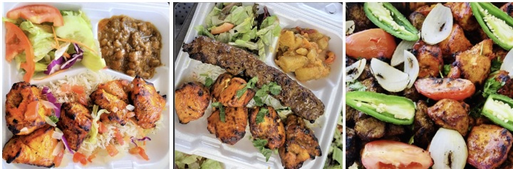 - Chicken, lamb, beef, veggie kabobs, salad, samosas. See complete menu online.